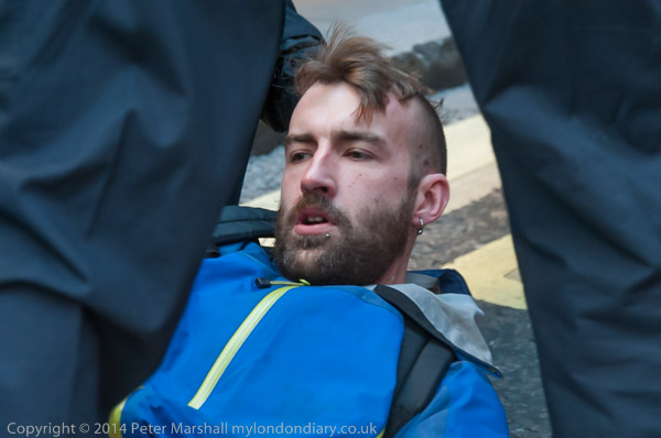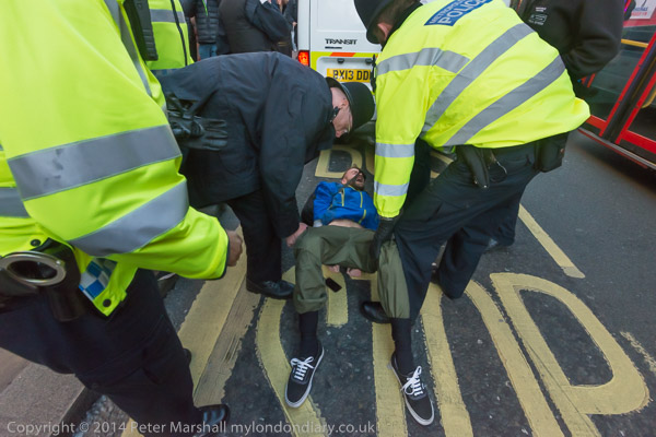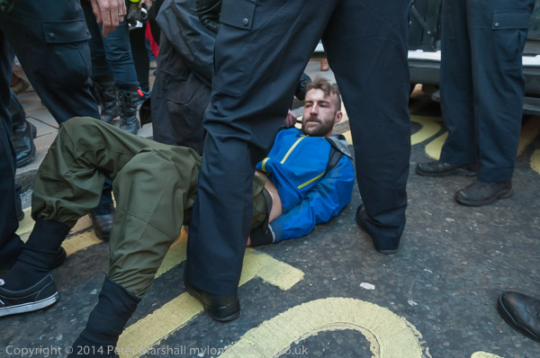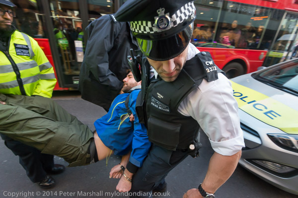 ![]() ![]() The protest has just come to an end when ![]() police rush by carrying a protester who is still shouting for the cleaners to get the London Living Waget ![]() They put him onto the road on Oxford St at the back of a police van ![]() ![]() and then into the back of the van. |