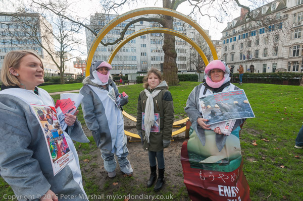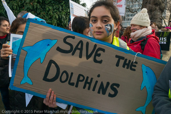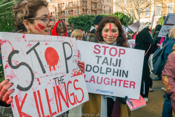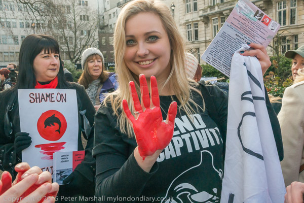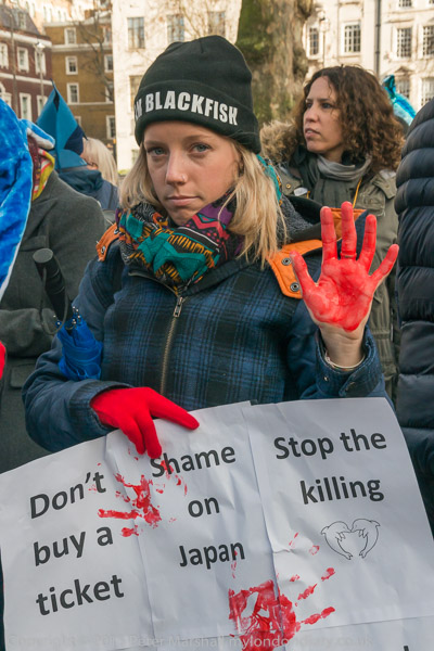 'Stop the Slaughter' t-shirts with a photograph of the blood-red sea during the annual Taiji massavre