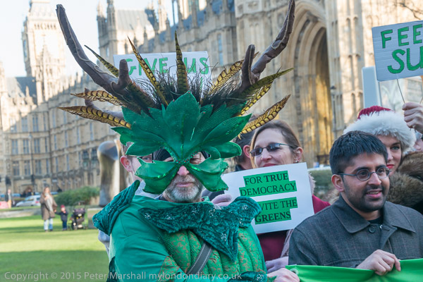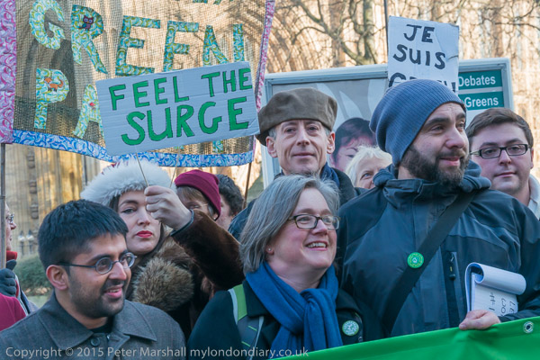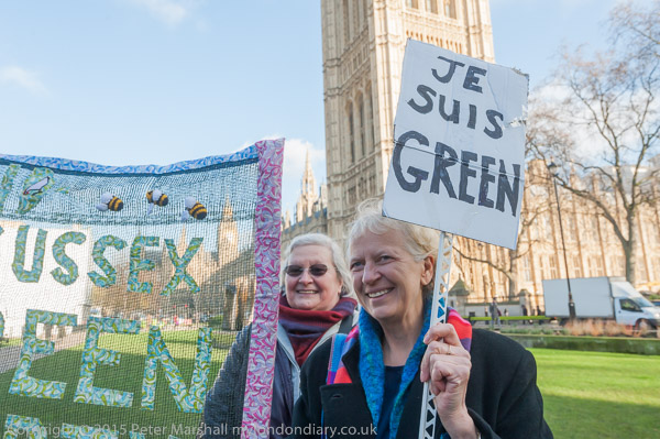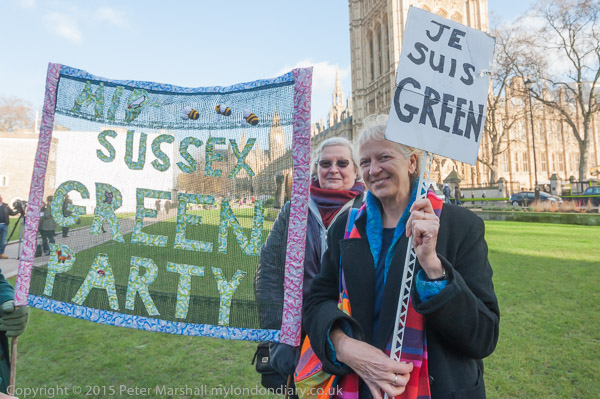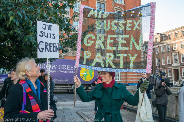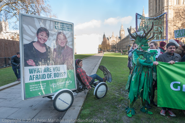 ![]() Tory Blogger 'Guido Fawkes' had a chicken on College Green with the message 'Don't be a Chicken' for Nick and Ed ![]() ![]() The Green party had two pedal-powered advertising posters cycling around Westminster and to the photo-op ![]() Natalie Bennett, Green Party Leader, speaks in front of a photshopped image of herself on the poster ![]() ![]() And with her on the poster was Caroline Lucas ![]() Green Party Women hold the Green Party Women's banner ![]() Sussex Greens have bees on their banner and a 'Je Suis Green' placard ![]() ![]() A different doggy bag ![]() |