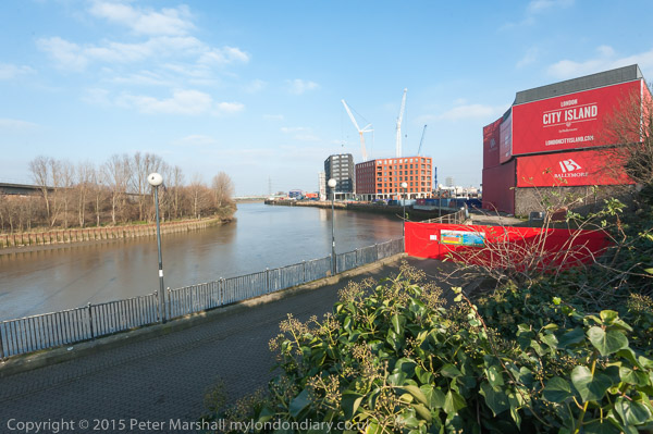 City Island. The bew red bridge across Bow Creek is visible in the distance at right of picture