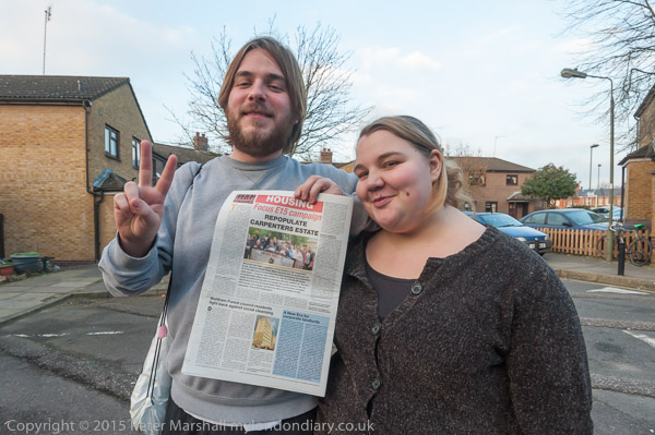 Sam Middleton and Jasmine Stone of Focus 15 wearing Our West Hendon 'Homes Before Profit' t-shirts