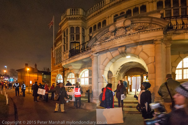 a photo opportunity in the dark outside Hendon Town Hall