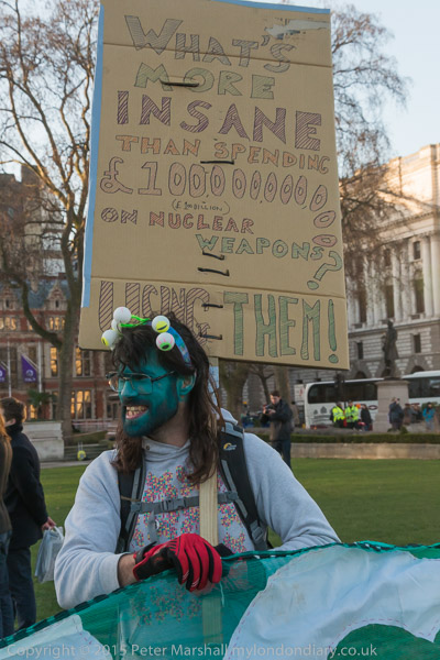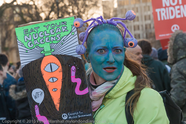 A nuclear mutant holds a large placard 'Invest in Peace'