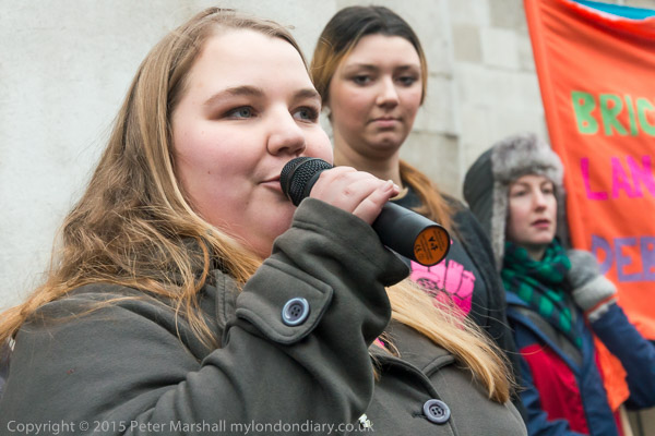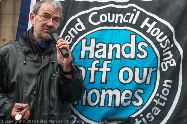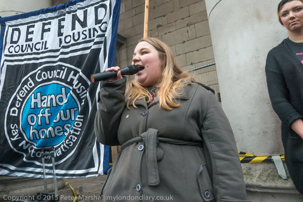 Jasmine speaking next to the 'Defend Council Housing' banner