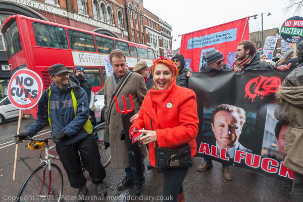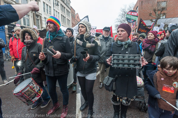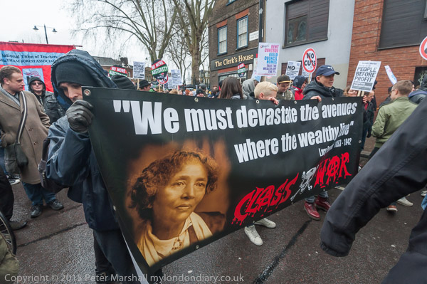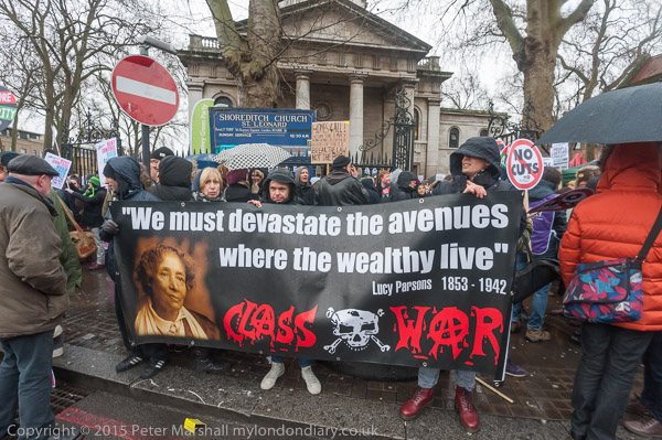 Outside the churchyard people are ready to march - Class War with their Lucy Parsons Banner