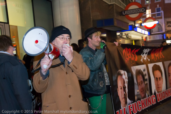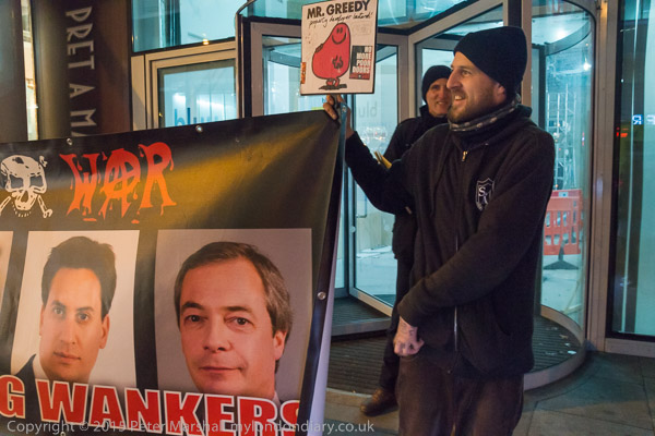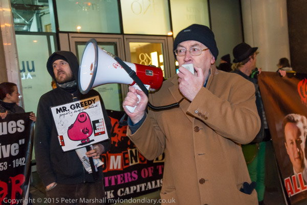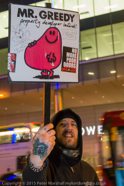 Police guard the poor door for the protest - perhaps it is still broken? The lighting has been improved