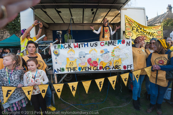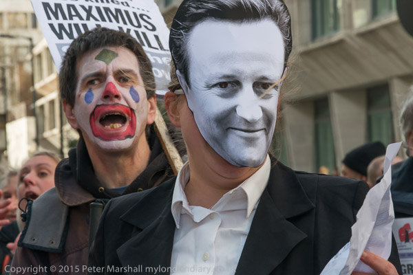 The protest began outside the offices of Maximus in Queen Anne's Gate, and then moved on to take over the nearby mini-roundabout in Petty France as a 'circus ring', with various circus-styled performances, including a hula hoop display by Alice Rose and singing from Rockin’ Paddy who performed 'Battle of Whitehall' and the Kilburn Unemployed Worker’s Group Choir wearing David Cameron masks sang their 'David Cameron is a W******'.