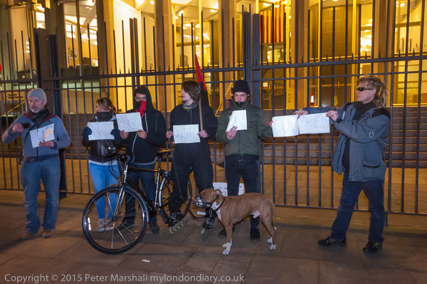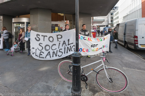 The protesters and supporters, who included Jasmine Stone from Focus E15 with her daughter and several members of the Revolutionary Communist Group, brought banners and stood around the main door to the office building, one upper floor of which is Annington's offices.