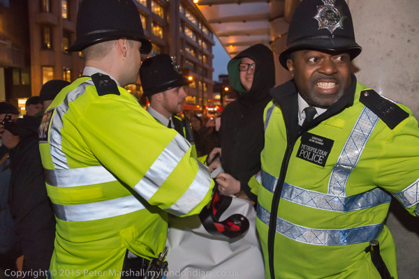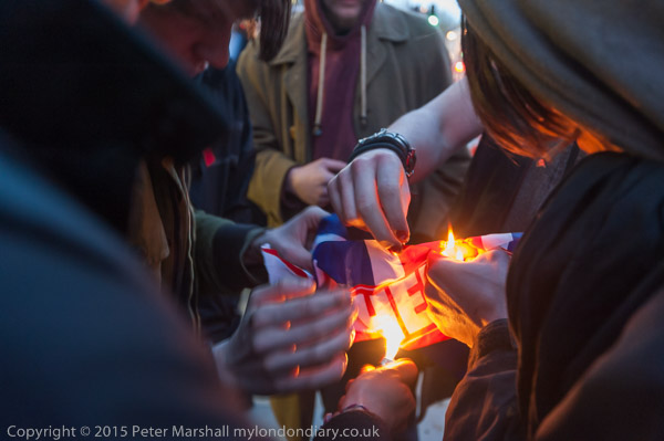 A group of anarchists from an occupation in London arrived to join in the protest, and attempted to burn a Union Flag with little success - it would not burn, though it did melt a little. They stamped on it and tried again, before giving up, and then went to take a look at the door for social tenants - the 'poor door' - down the side alley.