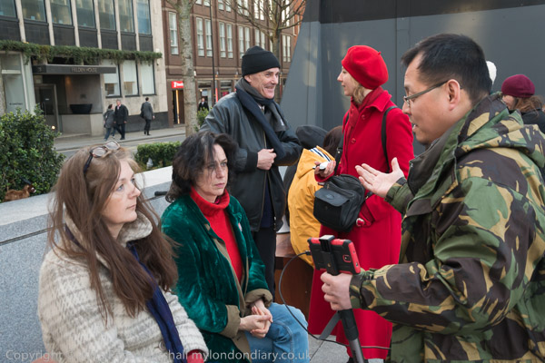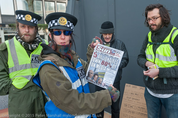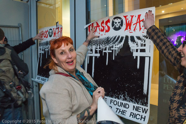 Class War continued their weekly protests outside the 'rich door' of One Commercial St which they began at the end of July 2014, 8 months ago. The pavement was still restricted by work being carried out on the front of the building and the pavement, though little if anything appeared to have actually been done since last week, and the protesters feel the 'works' are simply designed to hinder the protests.