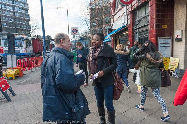 RMT Members handed out flyers outside the Elephant & Castle Bakerloo Line station today against the closure of the ticket office and 25% staff cuts which they claim will endanger the safety of both passengers and staff.