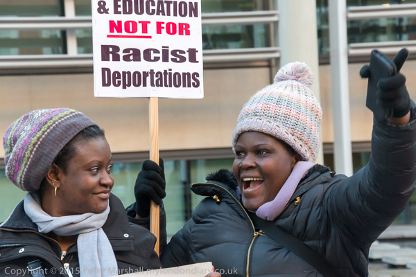 The first group of protesters arrives and poses with the 'End Detention, End Fast track' Movement for Justice banner