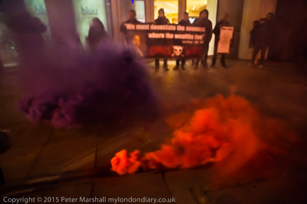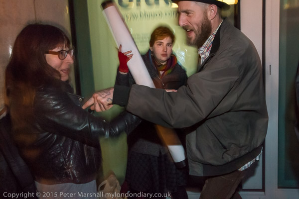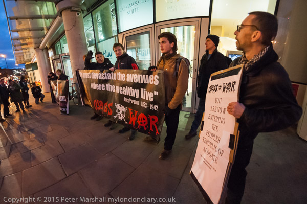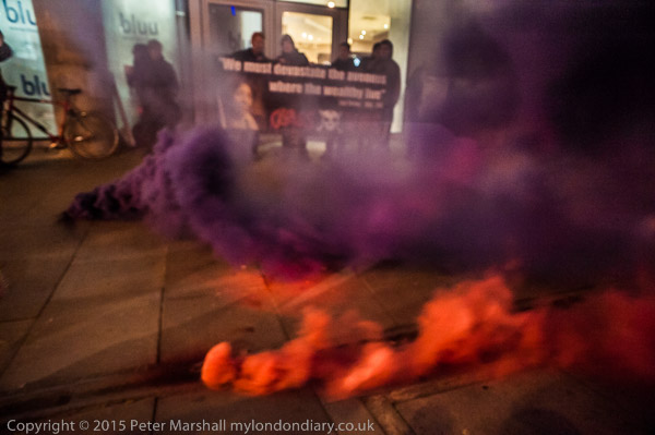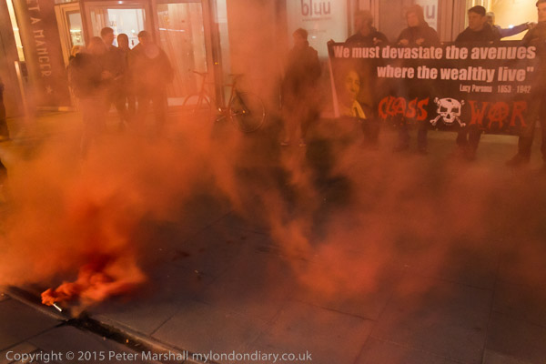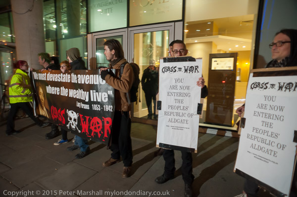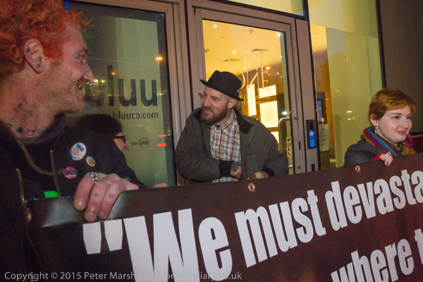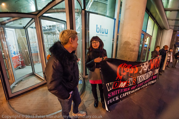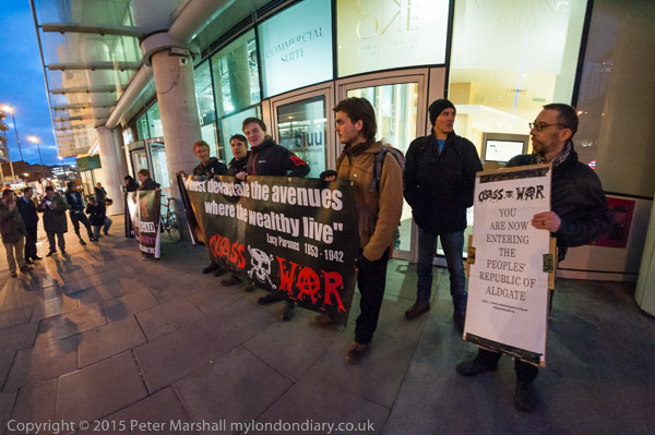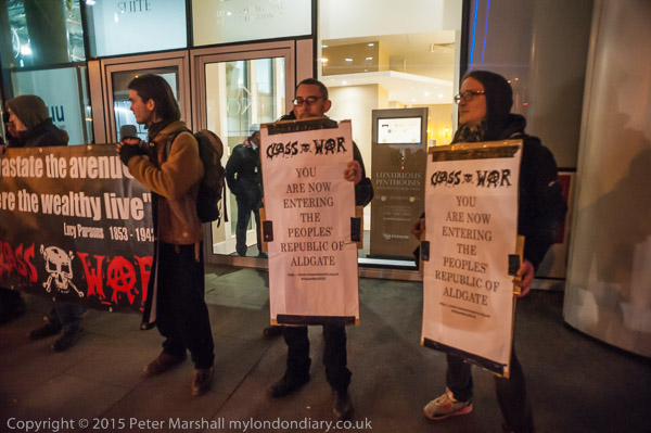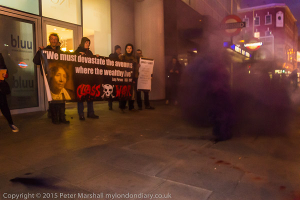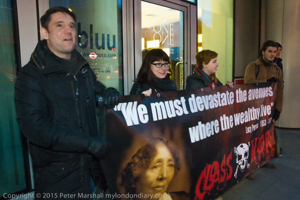 Protesters arrive and hold a banner in front of the 'rich door'.