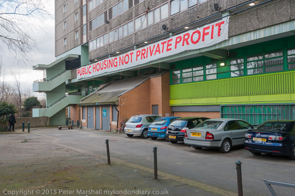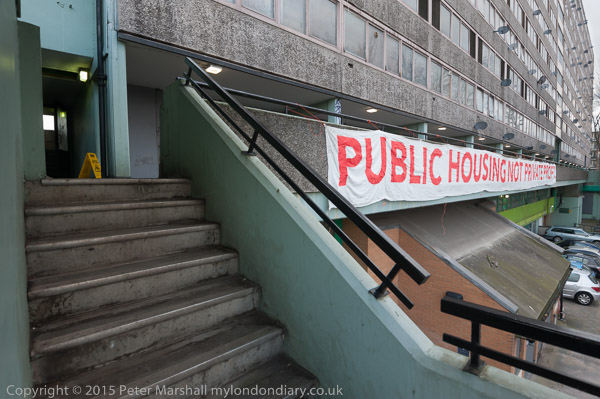 Protesters put up a banner 'Public Housing not Private Profit'. They told us after we had taken pictures
