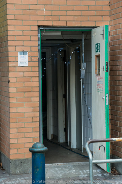 A trolley outside the occupied area at the base of Chiltern. This was offices and community space, not residential