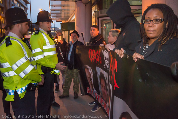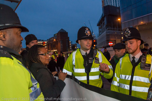 Constable Reihill tells each of those holding the banner that they are committing an offence