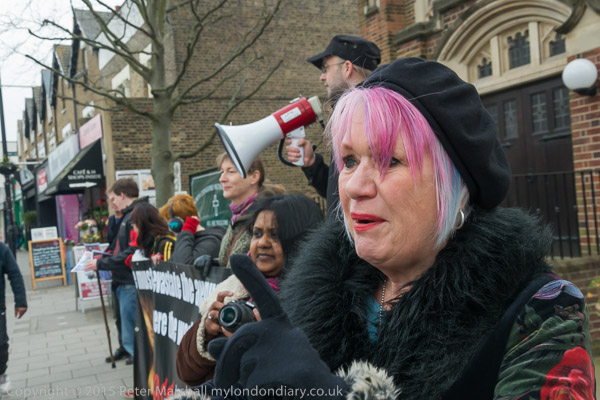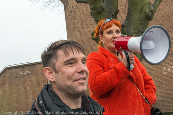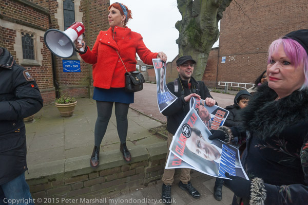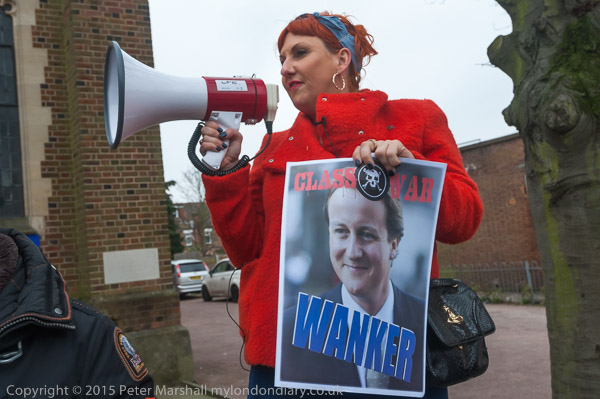 Lisa McKenzie holds a 2010 Class War election poster of David Cameron at the rally