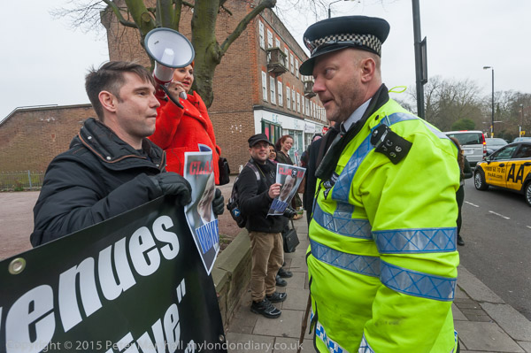 The officer tells Stan he will be arrested unless he puts the poster away and goes back over the road to the parked police van
