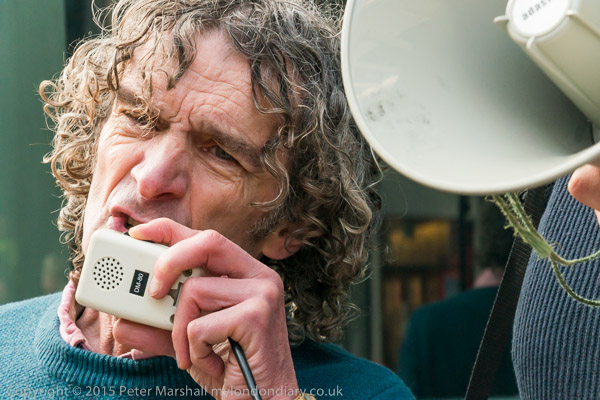 A man - perhaps a banker - stops to criticise the protesters. He claims not to be able to understand the banner about the 1%