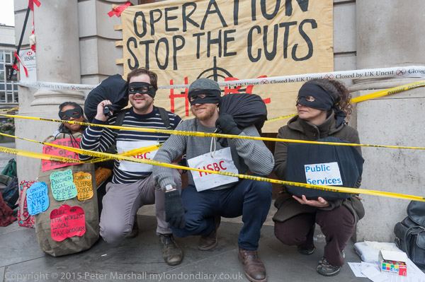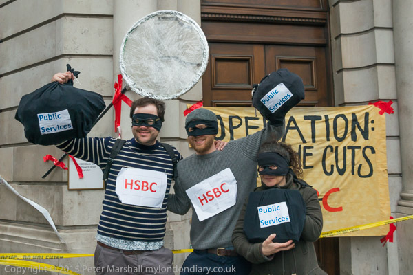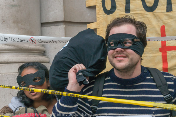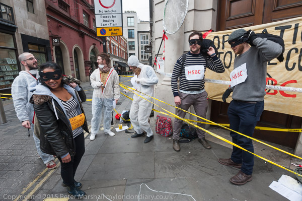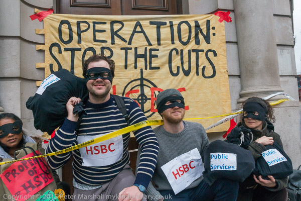 One of the HSBC burglars with a notice 'Tax Dodging is Theft'