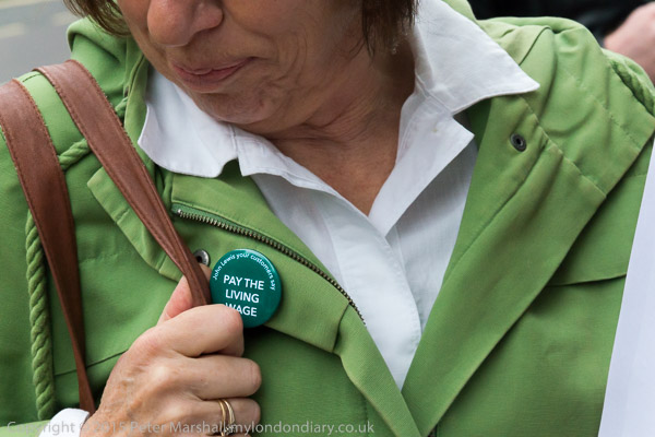 A new badge 'John Lewis your customers say PAY THE LIVING WAGE'