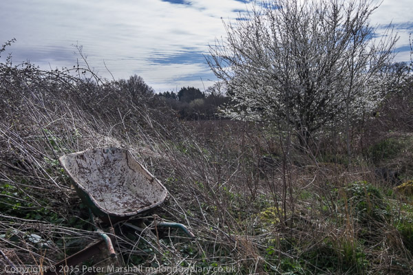 including this wheelbarrow and whitethorn (aka blackthorn) in flower