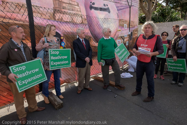 Neil Keveren of Stop Heathrow Expansion in front of the Heathrow mural where the boundary would be