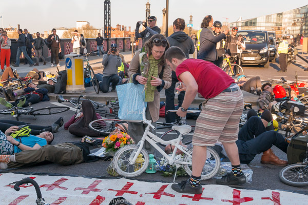 The die-in stretched all around the roundabout where the bridge meets Millbank and Horseferry Rd