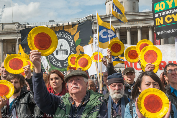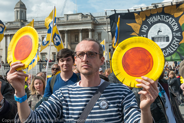 A striking National Gallery worker holds up two 'sunflowers' in front of their 'No Privatisation' banner and the dome of the National Gallery