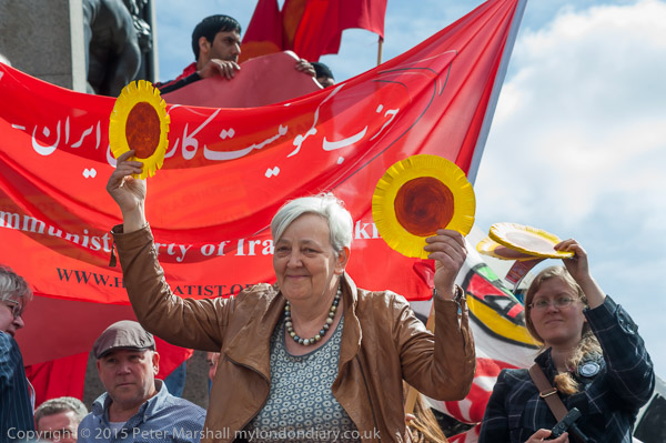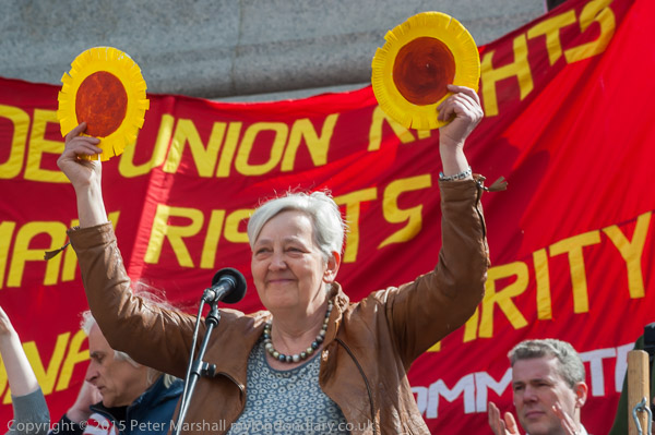 Victimised union rep Candy Udwin holds up sunflowers in each hand to the cheers of the crowd before she speaks