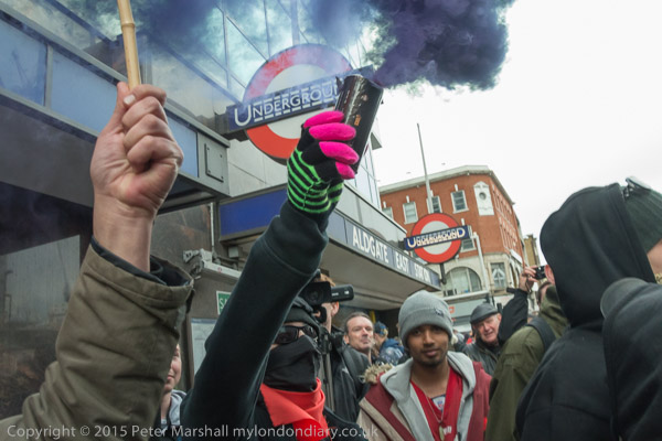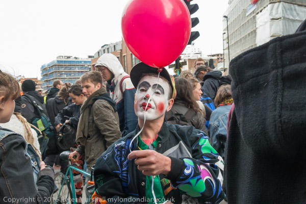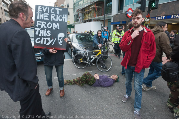 and the protesers moved onto the road, with one person lying down and another holding a poster 'Evict the Rich from this City'