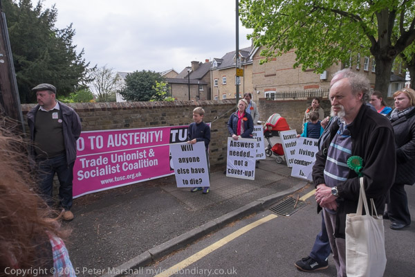 Stand Up for Spelthorne protest at Conservative Party constituency HQ in Staines, Middx organised by TUSC against Cuts.