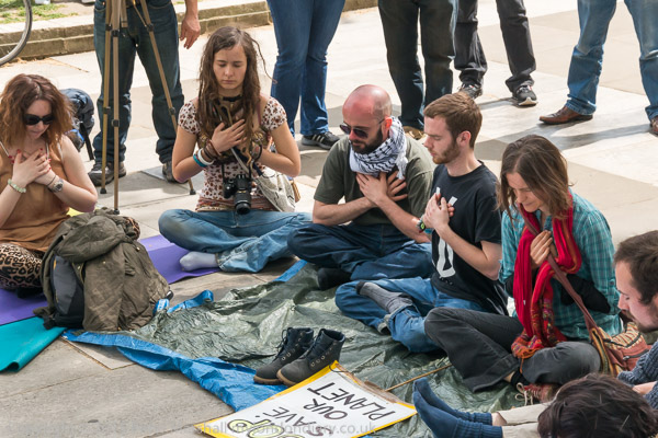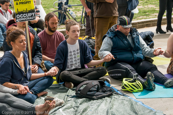 People join hands in meditation around the circle led by Donnachadh McCarthy