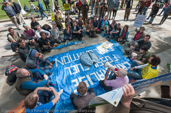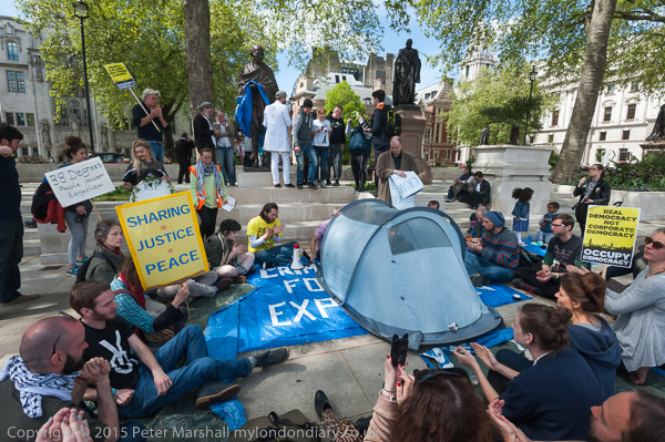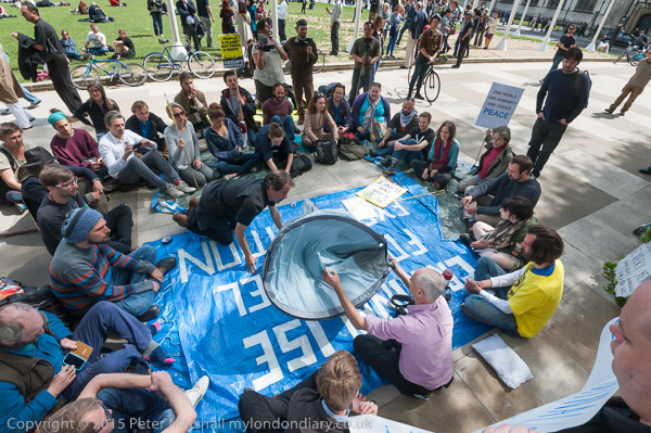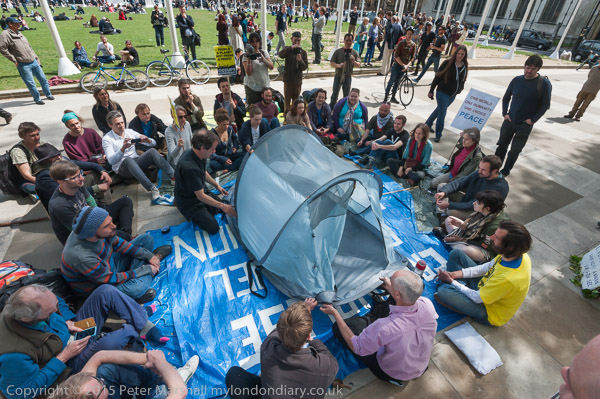 Donnachadh McCarthy puts a tent in the middle of the blue tarpaulin in front of him