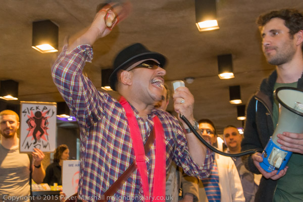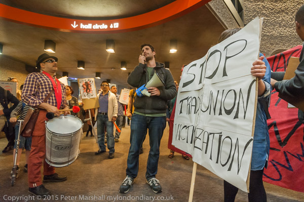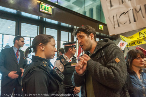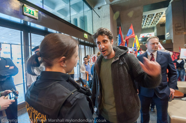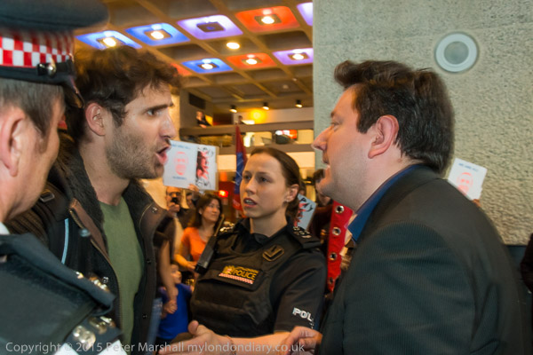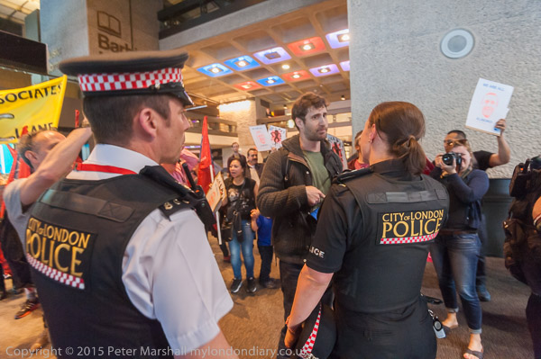 UVW General Secretary Petros Elia talks with police and a Barbican manager