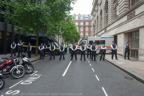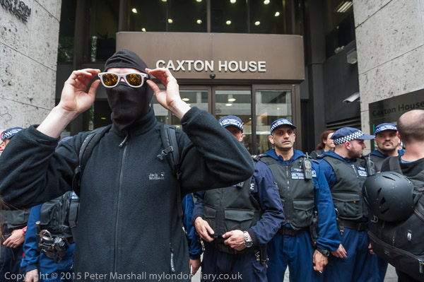 ![]() But soon police realised that too many protesters had simply walked past them and stood to the side ![]() People go through the gap between police vans on the edge of Parliament Square ![]() ![]() The Ahwazi protesters stopped in Parliament Square for a rally while the rest marched on ![]() ![]() A man stoppe a police van briefly, but soon moved as police threated to carry him away ![]() The marchers continued around Westminster ![]() and I met up with them again on Tothill St, where police protected the Dept of Work & Pensions in Caxton House ![]() and the Tory Party HQ around the corner ![]() Later they came back up Whitehall and protested noisily outside Downing St ![]() to a large audience of police in front of the gates ![]() |