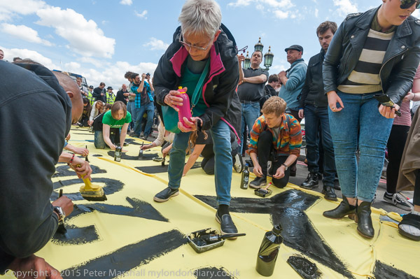 The painting continues and the slogan is '£12 bn more cuts £120 bn tax dodged - AUSTERITY IS A LIE'