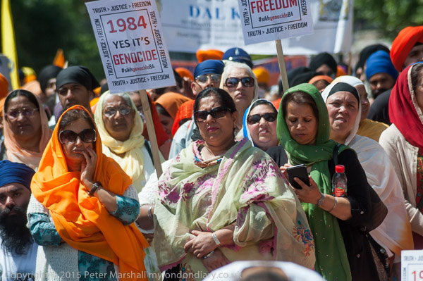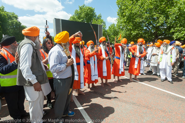 Khalsa representing the Five Blessed Ones draw their ceremonial swords at the start of the Sikh Freedom march