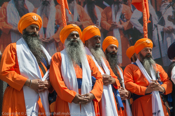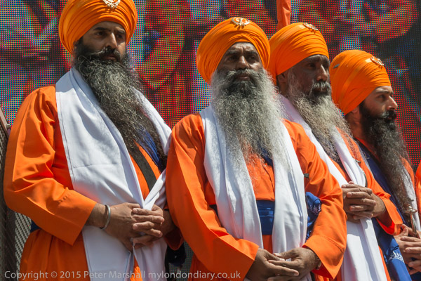 Five Khalsa representing the Blessed Ones along with two bearing the Sikh standard walk barefoot up towards the stage