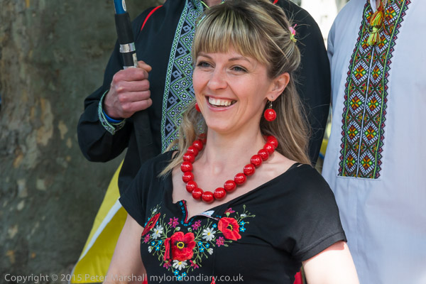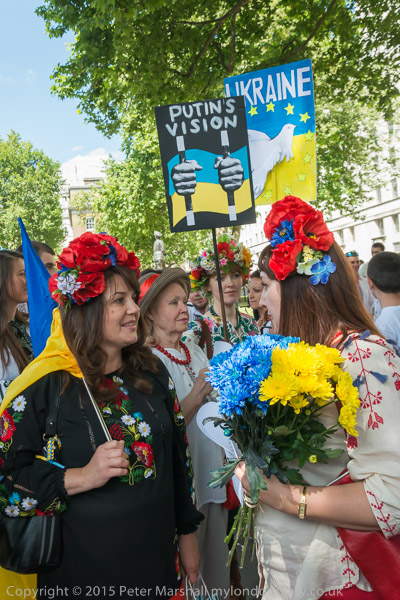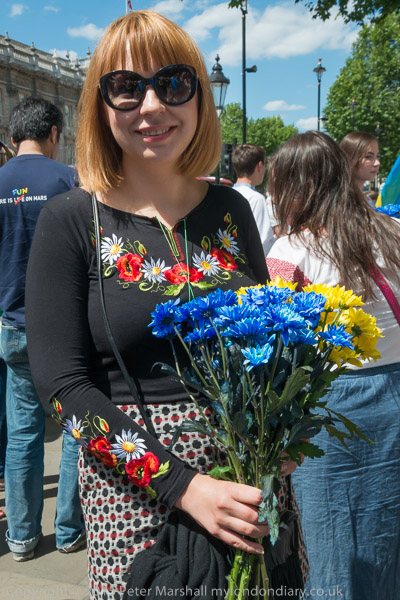 Women wear traditional Ukrainian Vyshyvanka embroidered shirts. Some carried flowers in the blue and yellow of the Ukrainian flag.