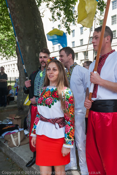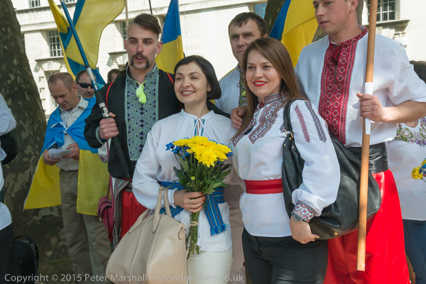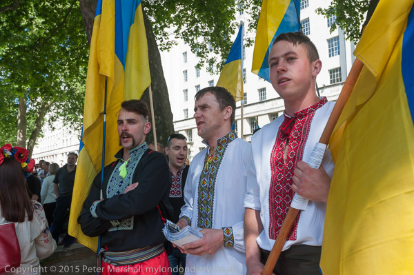 Some men had shirts with embroidered trim and wore traditional clothes, holding poles flying the Ukrainian flag