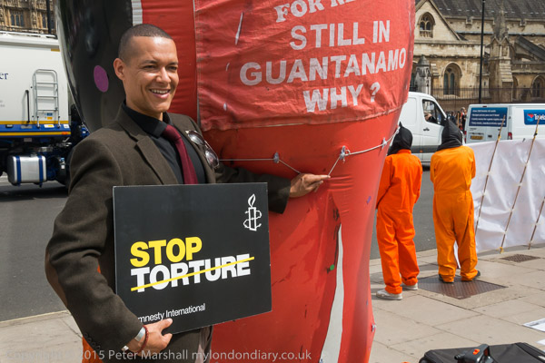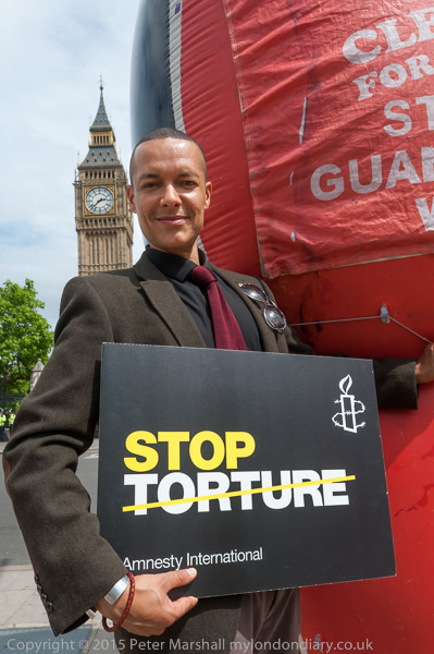 Labour MP for Norwich South, Clive Lewis, stands with Shaker Aamer holding an Amnesty International poster 'Stop Torture'
