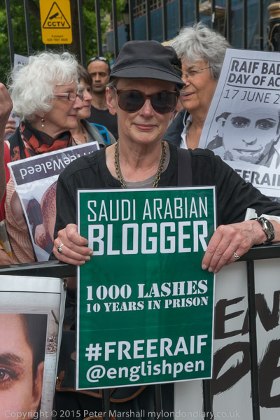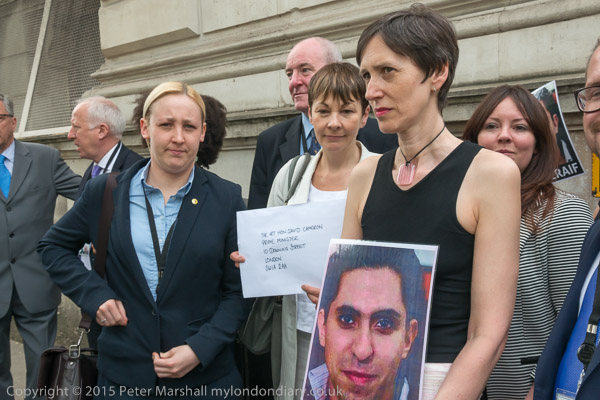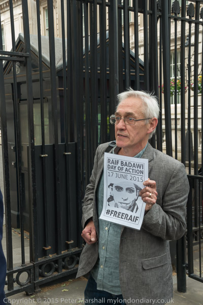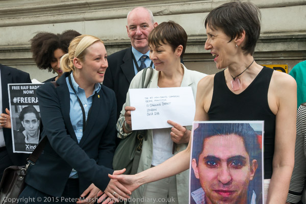 Peter Tatchell and Natalie McGarry MP outside Downing St with letter to David Cameron and picture of jailed blogger Raif Badawi.