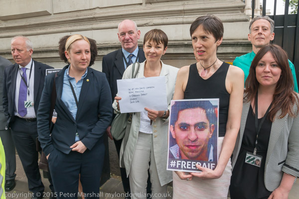 and Stewart McDonald MP outside Downing St with letter to David Cameron and picture of jailed blogger Raif Badawi