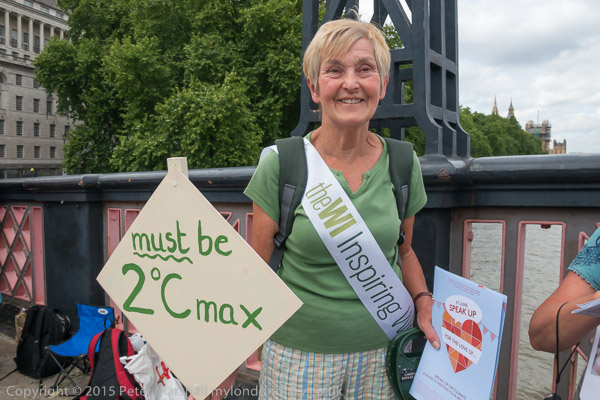 A woman from the Women's Institute with a warning sign that we must keep the temperature rise to a maximum of 2 degrees