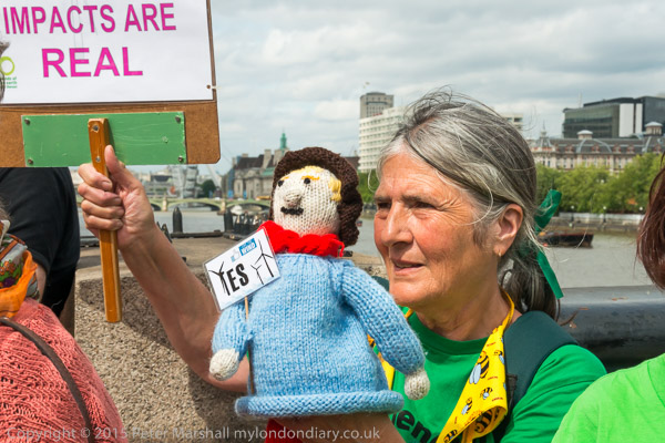 A woman holds a knitted glove puppet supporting the Navitus wind farm off the Isle of Wight