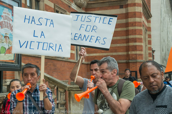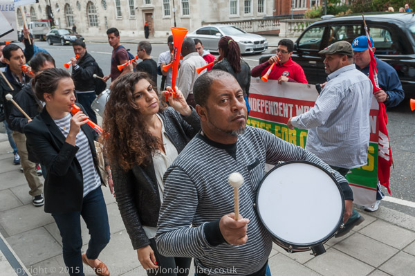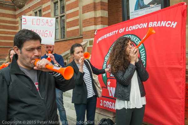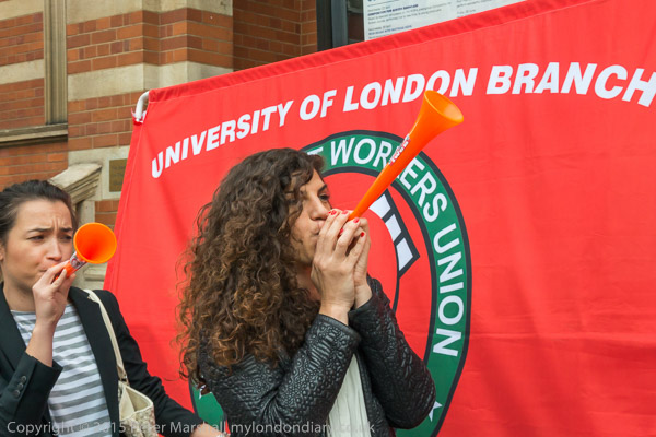 The protesters start to walk in a circle in front of the main entrance as they make a real din