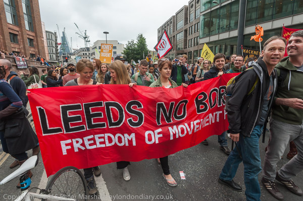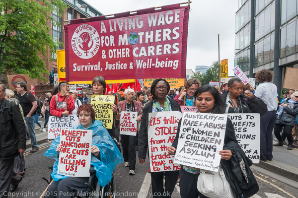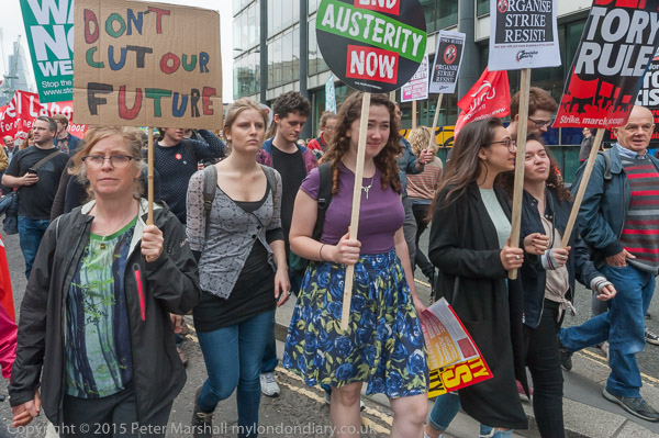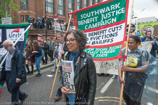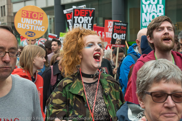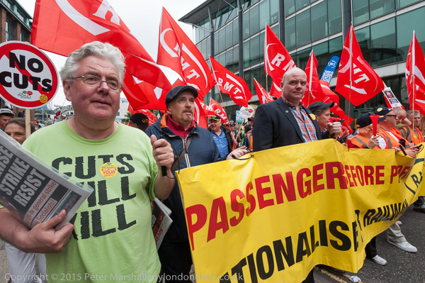RMT - John Reid, London Transport member on the RMT Council of Executives in 'Cuts KILL' t-shirt - Passengers Before Profit banner-