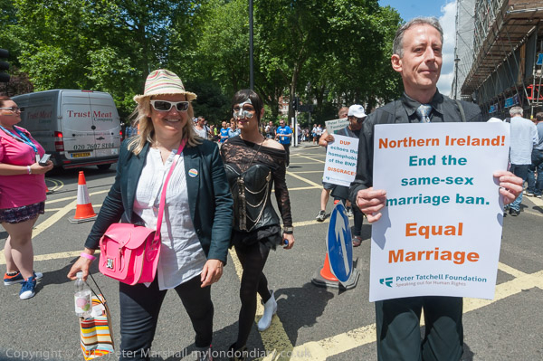 Peter tatchell with a poster calling for an end to the ban on mixed-sex marriage in Northern Ireland