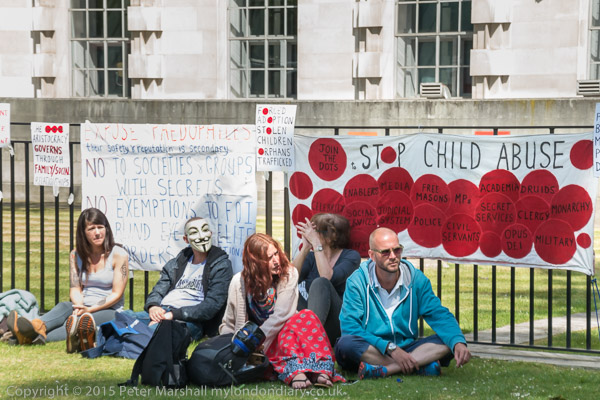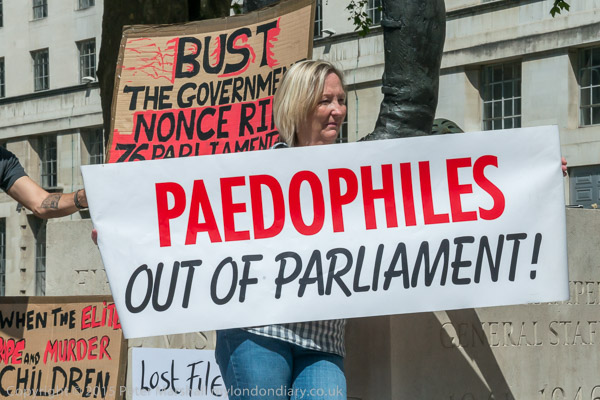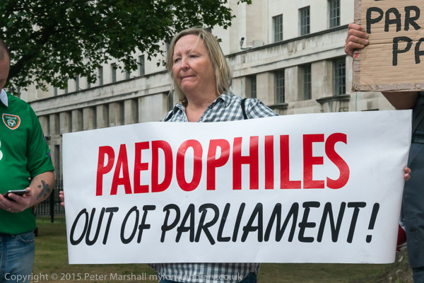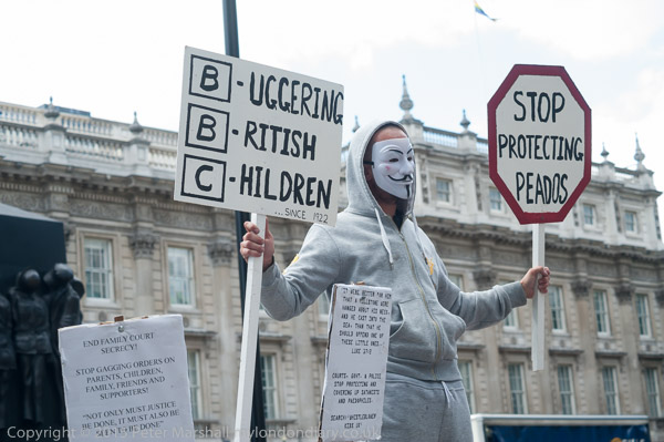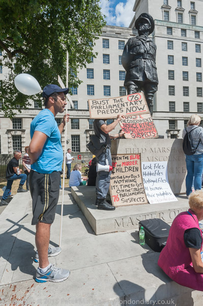 A man speaks at a rally at Downing St calling for an end to the government and police covering up of child abuse.